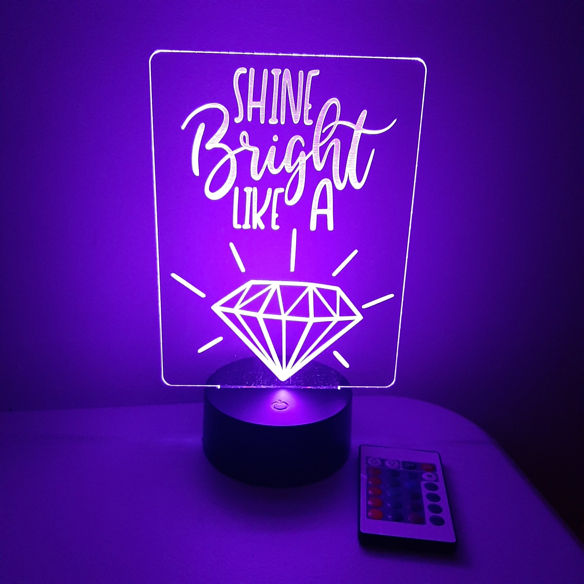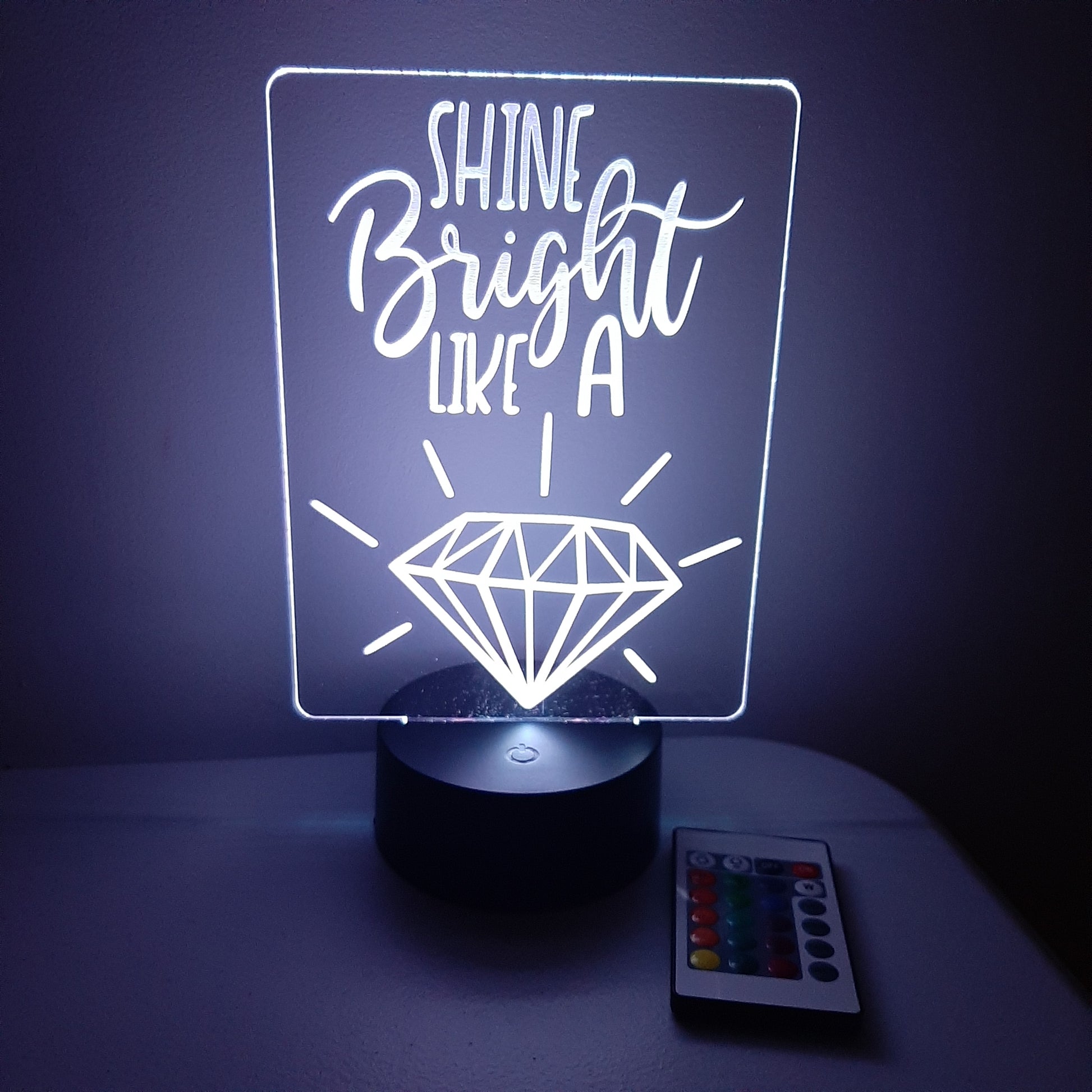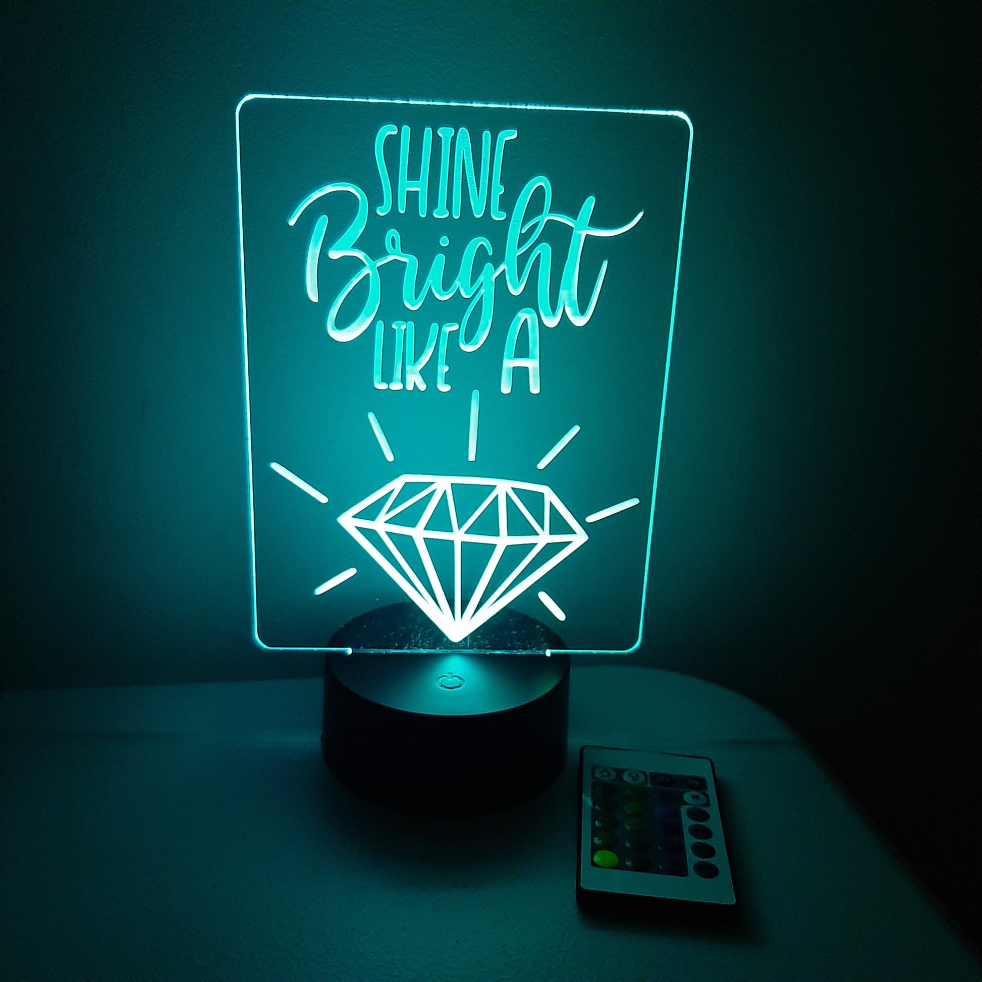 SHINE BRIGHT LIKE A DIAMOND LED NIGHT LIGHT laser engraved. It comes with the acrylic sign, LED base, remote control and power supply.