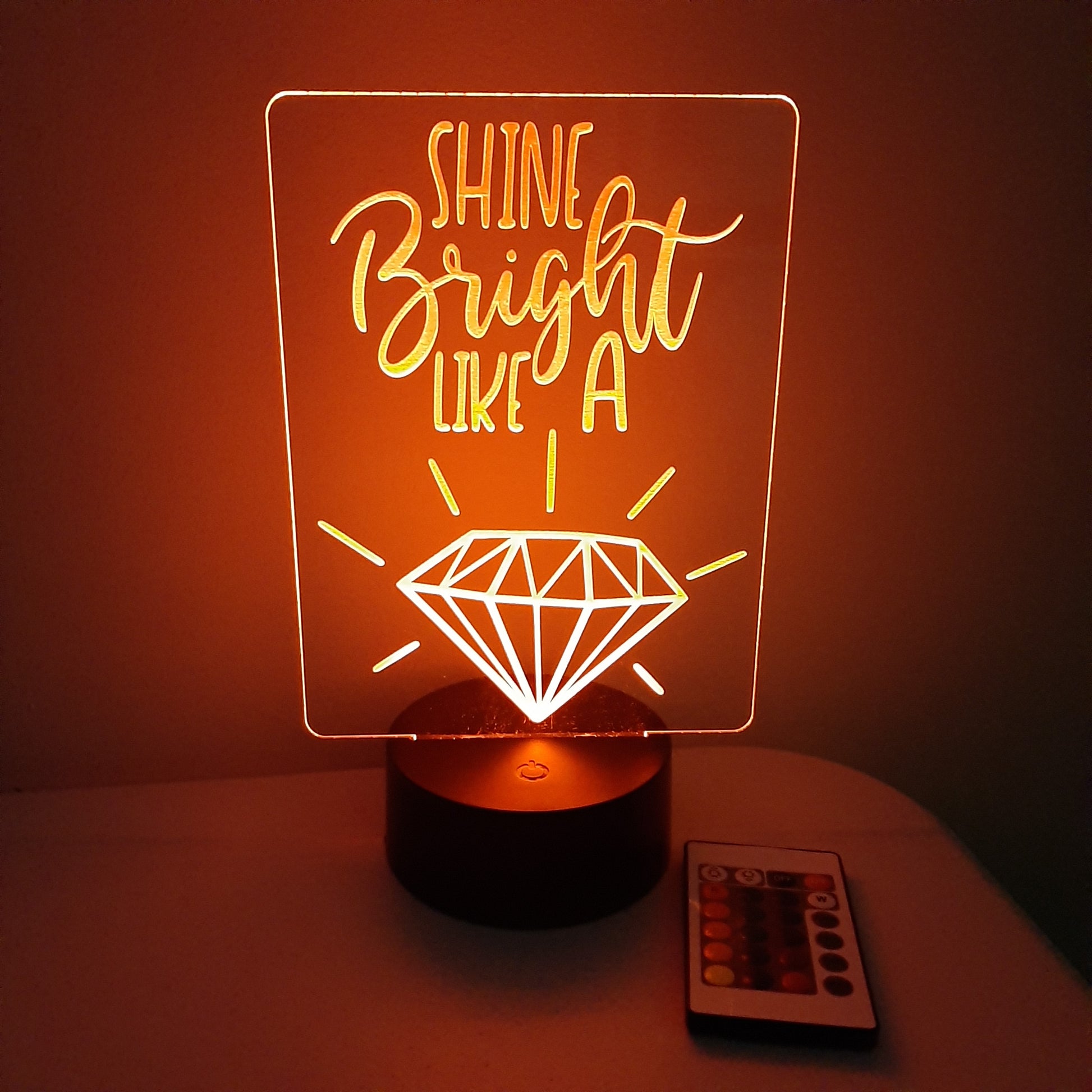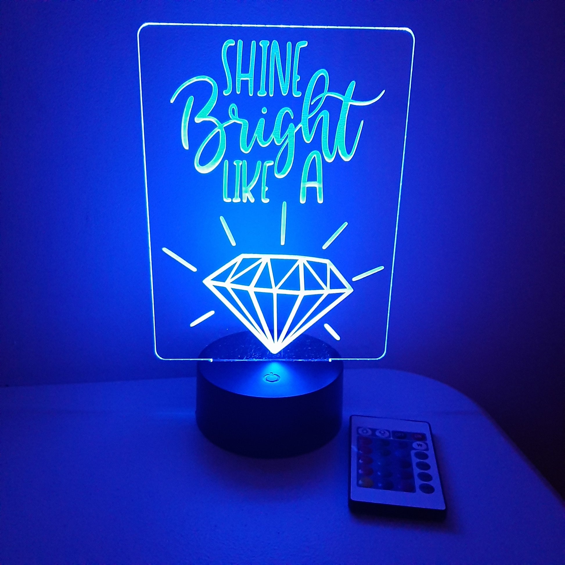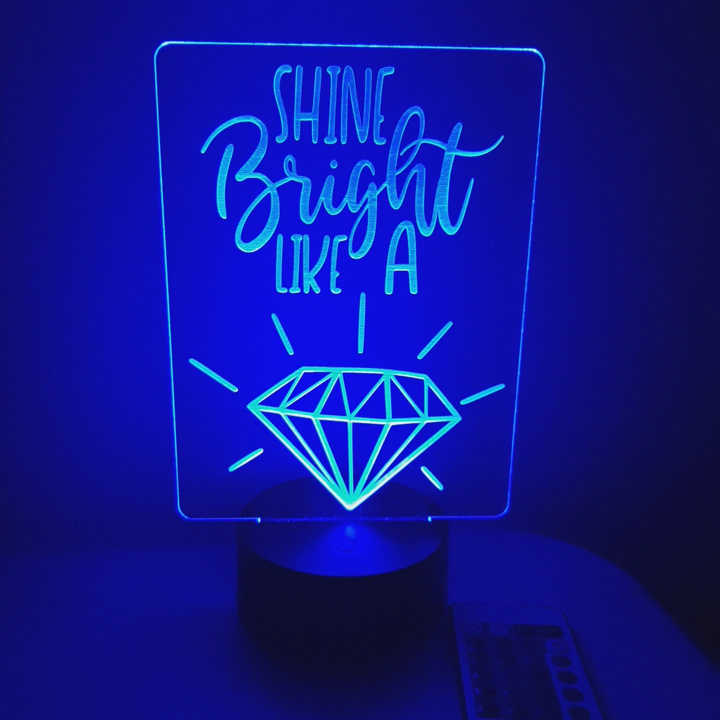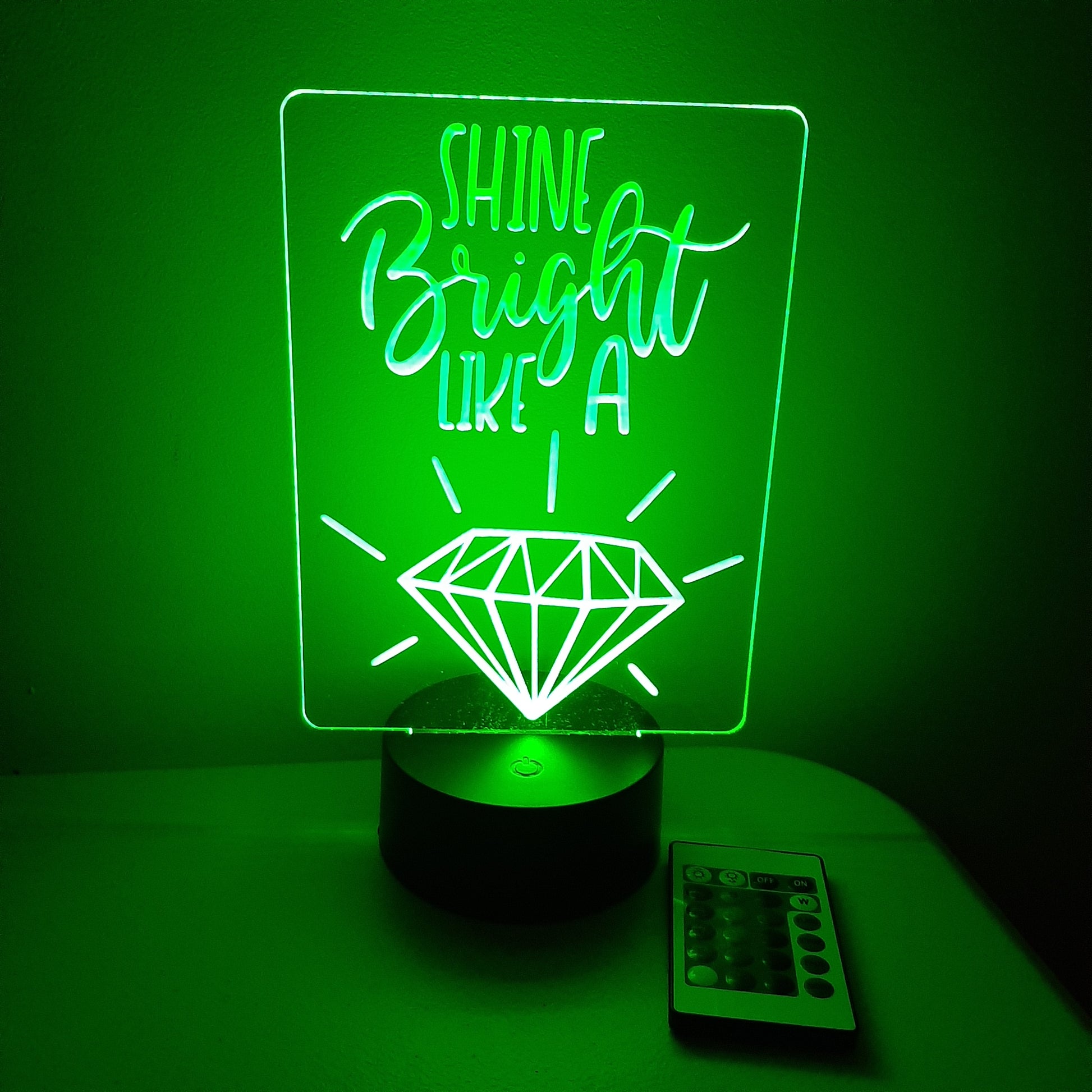 SHINE BRIGHT LIKE A DIAMOND LED NIGHT LIGHT laser engraved. It comes with the acrylic sign, LED base, remote control and power supply.