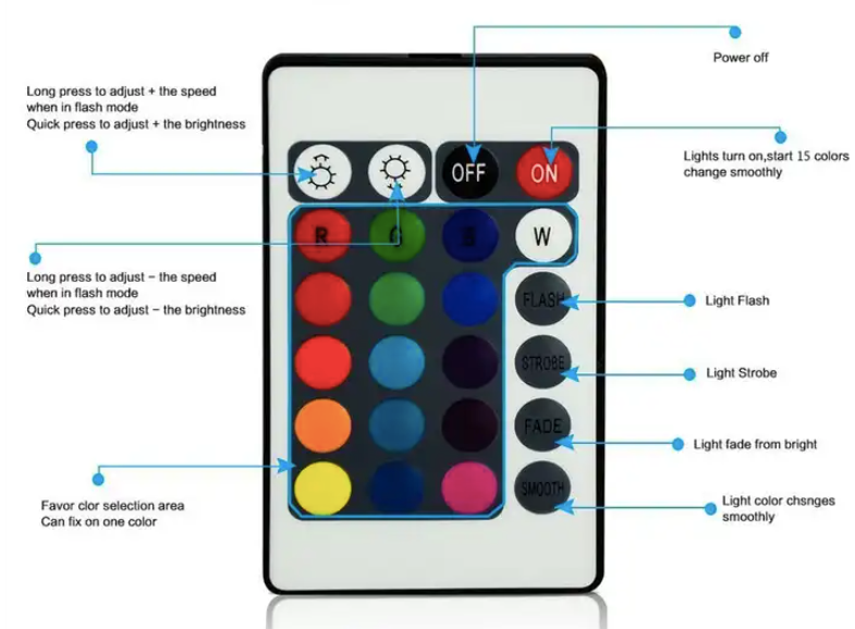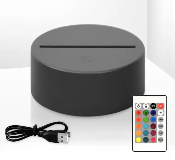 The LED light base is powered by 3x AA batteries (not included) or from the USB port. The included remote control allows 4 different auto modes for cycling through colors and 15 different static colors.